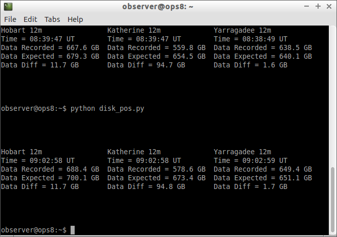Disk_pos.py will calculate the difference between recorded and expcted data amounts. You only need to set it up once for each experiment. On a terminal in ops8 (in the home directory) type