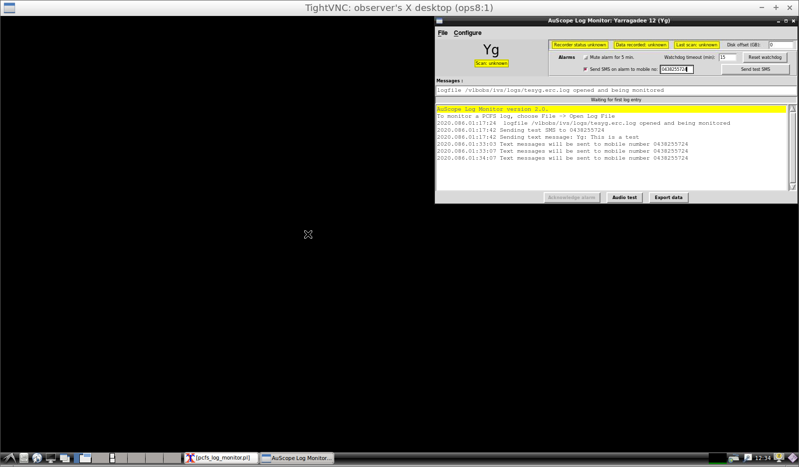 With the likely shutdown of the Physics building, it's now necessary to plan for off-site monitoring of experiments. At present, the plan is to do this through a VNC session running on ops8 (the main observing machine in the AuScope room). This allows for all the usual software to be used, with alarms being delivered by the SMS gateway. Ideally, it should be possible to support local forwarding of alarms (at least as beeps through the VNC program) but this hasn't been done as yet.