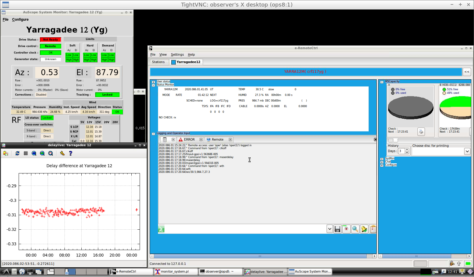 For typical IVS observations, it should be possible to run everything though this VNC session, including the e-remote control software, log & telescope monitors, delaylive and VNC connections to the PCFS/maser machines, etc.